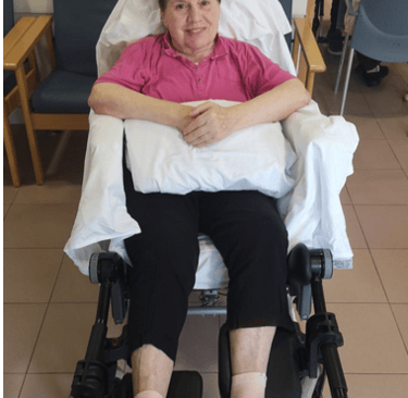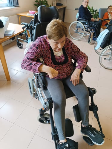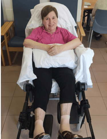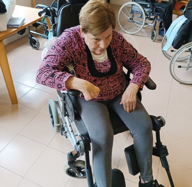 F es una señora que vive en una residencia para personas mayores. A día de hoy todavía mantiene conversaciones simples y coherentes a pesar de su deterioro cognitivo. F usa silla de ruedas basculante para un mejor posicionamiento durante el día.