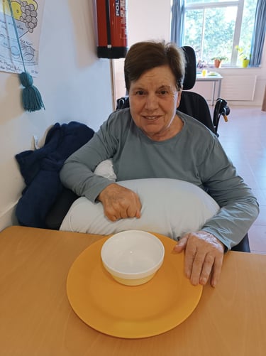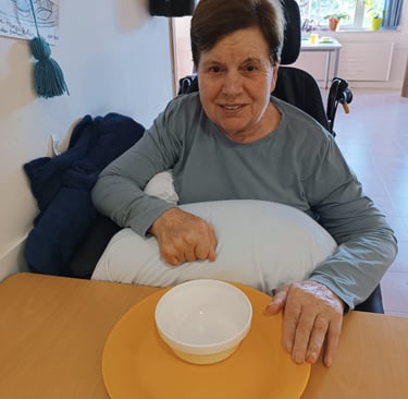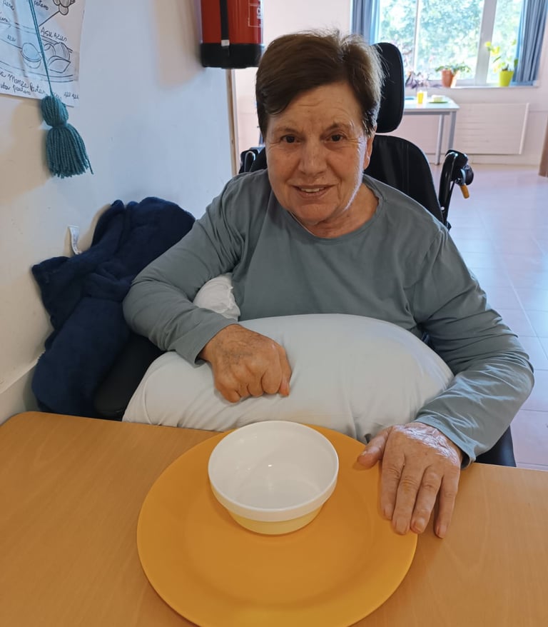 Cada mañana, cuando las auxiliares iban a despertarla y levantarla, intentaban sentarla de la mejor manera, aún así la espalda siempre le queda flexionada hacia adelante, sin llegar a hacer apoyo con el respaldo de la silla.
